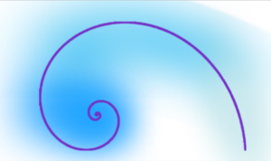 Опыт получен! Прекрасно! Но как его унести? Когда сворачивается в центре сотовой структуры сферический экран, на его месте жители будущего проявляют для вас символ, в котором сконцентрирован весь вами полученный опыт. Это – спираль Фибоначчи. Она фиолетового цвета и закручивается от центральной точки направо вверх. От неё идёт сияние голубого цвета, которое более интенсивно в центре, и слабее снаружи. Этот символ носит название: «Улитка гармонии преемственности». (Рисунок № 6).