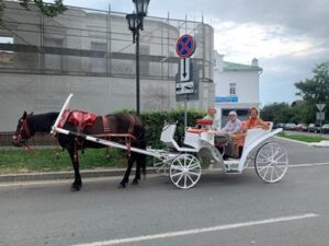 А затем отправились в сторону Кремля. На подходе к Успенскому храму на Кремлевской улице увидели местную достопримечательность – кареты и брички с лошадьми. Неожиданно возникла идея прокатиться по городу, познакомиться с Кремлем, будто отправившись в путешествие в прошлое. Сказано-сделано… Выбрали симпатичную карету с возницей в красной косоворотке и черной фуражке. В карету была запряжена лошадь гнедой масти. Как выяснилось, лошадь звали Лола от Лолита, а возницу Борислав. Нам было предложено совершить двадцатиминутную экскурсию по городу. Не успели мы усесться в карету, как она тронулась и наш кучер начал свой рассказ. Он оказался прекрасным гидом и экскурсоводом. За 20 минут путешествия мы прослушали краткий курс истории города и получили огромное количество энергопакетов.