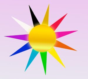 РИСУНОК № 7. ЗОЛОТОЙ ДИСК диаметром 33 сантиметра с 11-ю лучами по окружности: красного, розового, оранжевого, жёлтого, зелёного, голубого, синего, фиолетового, белого, чёрного, золотого цвета.