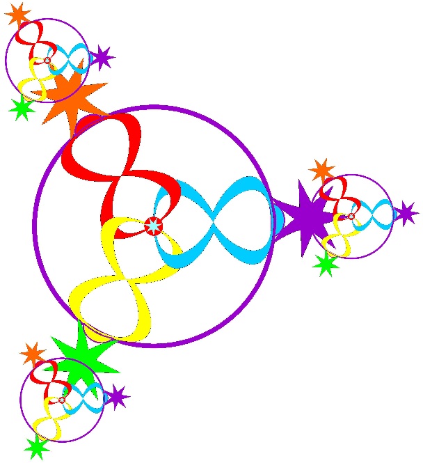 Мы с вами проходим Солнце, наша спираль начинает сужать свои витки, и мы с вами постепенно приближаемся к вашей планете. И спираль уходит в самое Сердце планеты. Это — нижняя точка вашего Кристалла Света. Посмотрите, кем принимается новая магнитная энергия в Сакральном пространстве вашей планеты? Она принимается Планетарной Голубой Розой. Но не только… Она принимается той фрактальной структурой трёхполярности, которую вы выстраивали двенадцатого декабря. Посмотрите, как из центральной семилучевой звезды она начинает наполнять красную сферу. Как по восьмёркам бесконечности растекается к звёздам, и как потом она начинает наполнять все фрактальные структуры, а их значительно больше, чем на вашем рисунке. Потому что эти фрактальные структуры уходят не только в каждую клеточку ваших тел, они уходят в каждую клеточку планетарную. И в каждую клеточку, в каждый атом всех жизненных форм, которые существуют на планете. А теперь мы с вами начнём заполнять этой энергией торы нового Небесного Свода. Мы с вами, из центра Сакрального Сердца планеты, перебрасываем восьмицветный радужный мост в каждый тор. И по этим радужным восьмицветным мостам мы направляем новую магнитную энергию. Посмотрите, как при этом, на тех мостах, которые мы перекинули, вибрирует лента фиолетового цвета. Как она активируется, и по ней передаётся новая магнитная энергия в торы нового Небесного Свода.