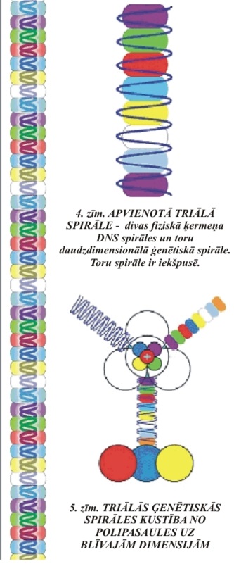Mēs sākam mūsu darbu ar Daudzdimensionālā Genoma triālās spirāles radīšanu. Tāda spirāle ir viens no galvenajiem daudzdimensionālās ģenētiskās informācijas nesējiem. Viņa veidojas no fiziskā ķermeņa divām DNS spirālēm, par kurām jums ir labi zināms, un vienas toru (no toriem sastāvošas) ģenētiskās spirāles. Toru ģenētiskā spirāle sastāv no astoņiem toriem, kuri bezgalīgi atkārtojas un nes savā “Es” speciālu ģenētisku informāciju par astoņām dimensijām (septiņām pirmā Garīgā Centra dimensijām un vienu, astoto, otrā Garīgā Centra dimensiju). Tā ir jauna ģenētiska struktūra, kura guva iespēju atnākt uz jūsu pasauli pēc tam, kad sākās Visuma otrā Garīgā Centra (dimensijas 12-8) un jūsu, trešā Garīgā Centra (dimensijas 7-1) saaudzēšanas process. Šajā darba etapā mēs apvienosim fiziskās DNS spirāli un toru daudzdimensionālo Spirāli. Rezultātā iegūstam DAUDZDIMENSIONĀLĀ GENOMA TRIĀLO SPIRĀLI. Tālāk mēs šo spirāli caur trešo dimensiju nosūtīsim uz otro dimensiju. Otrā dimensija ģenētiski īpašā veidā ir saistīta ar ceturto. No vienas puses, mēs atnesīsim Daudzdimensionālā Genoma enerģētisko informāciju uz otro dimensiju – ar tās tālākās evolucionārās attīstības mērķi. No otras puses, mēs bagātināsim mūsu Daudzdimensionālo Genomu ar otrās dimensijas ģenētisko informāciju, kas ļaus šajā etapā “sablīvēt” mūsu Genomu, uztaisīt viņa materiālo piesaisti blīvajās pasaulēs. Šajā etapā mēs pagaidām nevaram strādāt ar pirmo dimensiju, tāpēc ka tur vēl nav radīti visi nepieciešamie apstākļi mūsu darbībai.